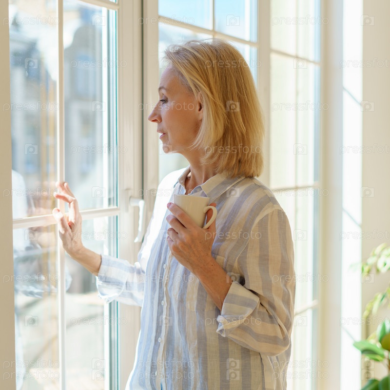 Красивая пожилая женщина с чашкой кофе смотрит в окно, наслаждаясь новым днем дома