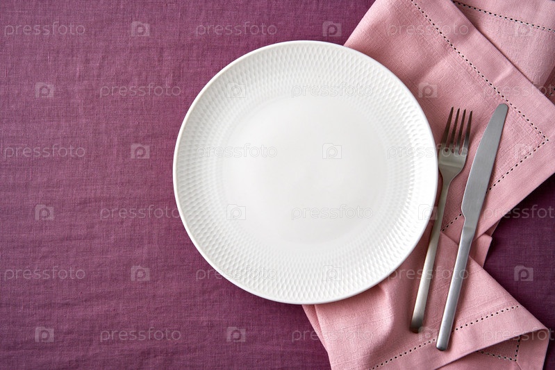 Место. Чистая пустая белая тарелка, вилка и нож на ярко-чернично-красной льняной скатерти, макет