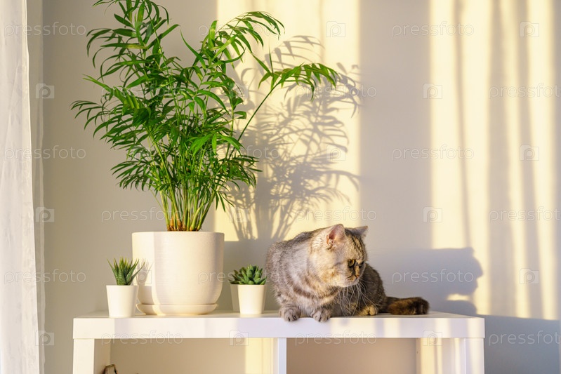 Красивая цветущая пальма Chamaedorea в горшке на полке стойки в квартире под светом заходящего солнца, жёсткие тени на стене