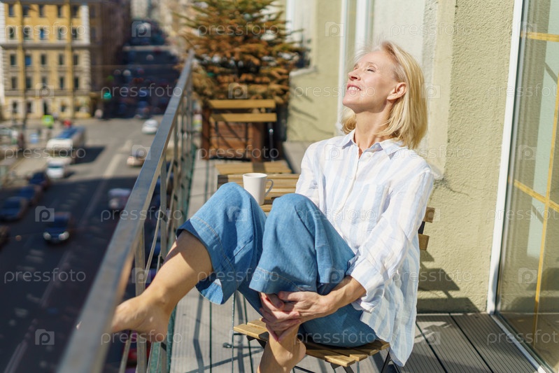 Счастливая пожилая женщина сидит на террасе с чашкой кофе и наслаждается прекрасным солнечным утром