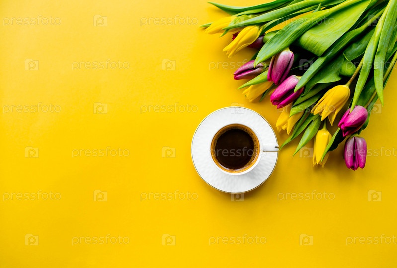 Баннер. Чашка горячего утреннего кофе и букет желто-сиреневых тюльпанов на ярко-желтом фоне. Вид сверху. Крупный план. Скопируйте место для текста. Концепция праздников и пожелания доброго утра