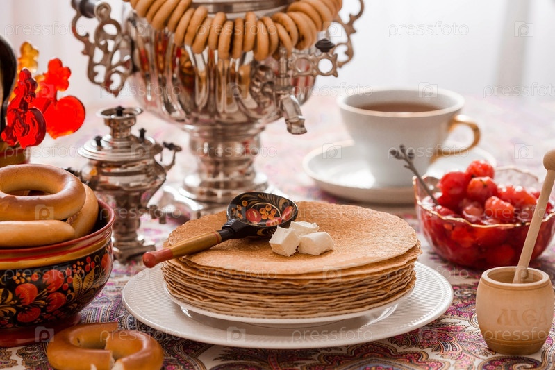 Русские традиции. Русский праздник Масленица. Натюрморт с чашкой чая, стопкой блинов, сметаной, медом, кубиками масла, рогаликами, сухофруктами, карамельным петушком и самоварами