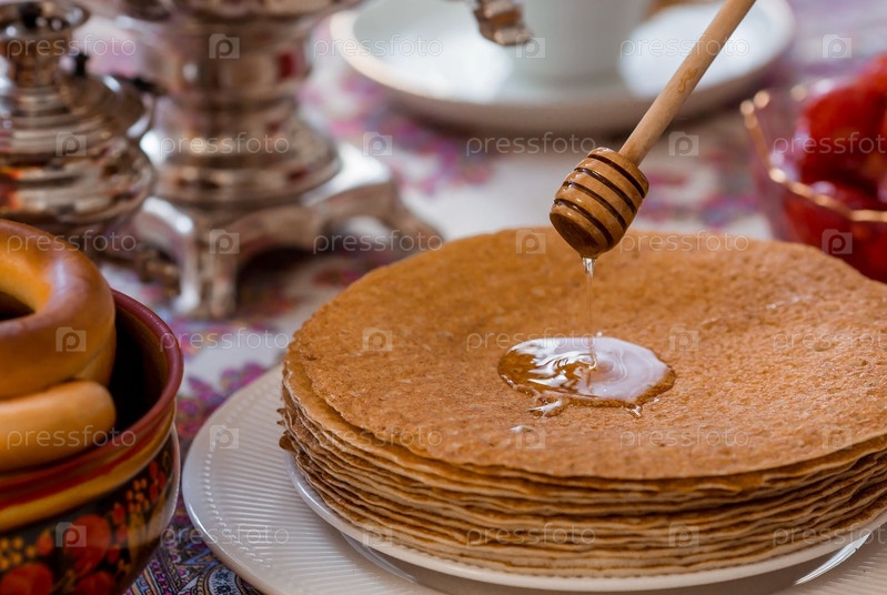 Русские традиции. Русский праздник Масленица. Натюрморт с чашкой чая, стопкой блинов, сметаной, медом, кубиками масла, рогаликами, сухофруктами, карамельным петушком и самоварами