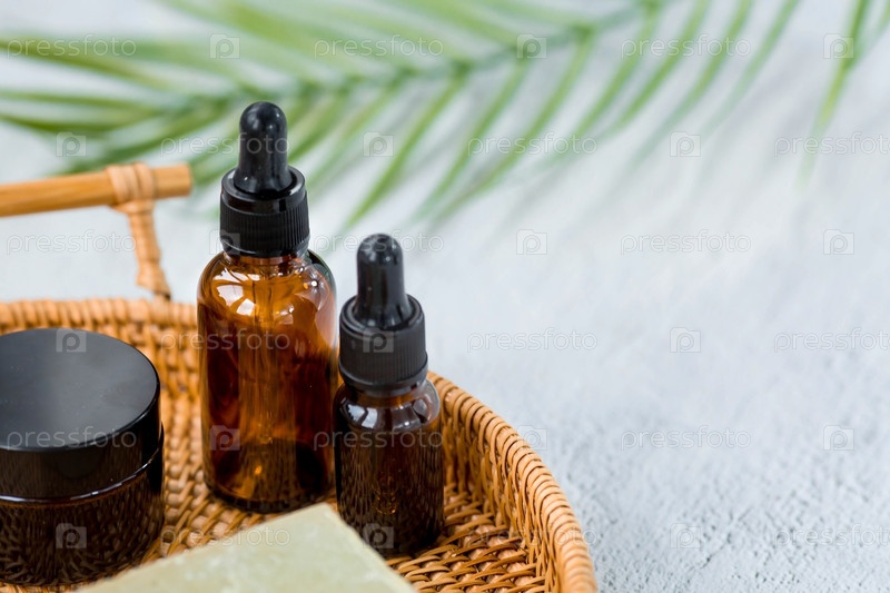 Ароматерапия. На подносе из ротанга стояла стеклянная бутылка с пипеткой для масла, лосьона, крема, массажная щетка и пальмовый лист. Натуральная органическая экокосметика. Макет брендинга салона красоты