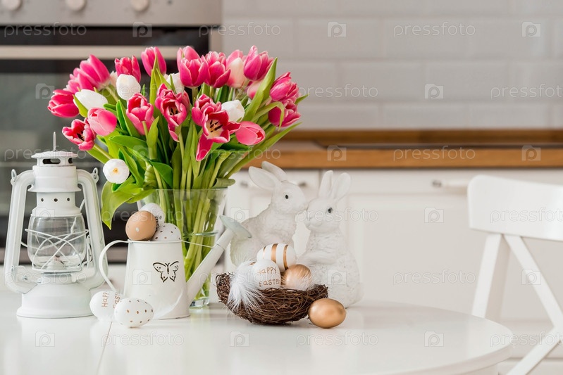 Букет тюльпанов, пасхальные кролики и яйца с золотым узором на столе. На заднем плане белая кухня в скандинавском стиле. Красивая открытка. Минимальная концепция