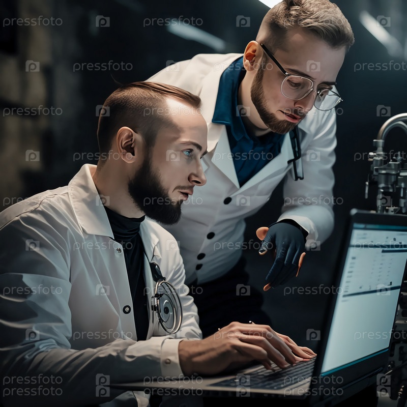Молодой ученый в комбинезоне объясняет данные своего коллеги-инвалида на дисплее ноутбука