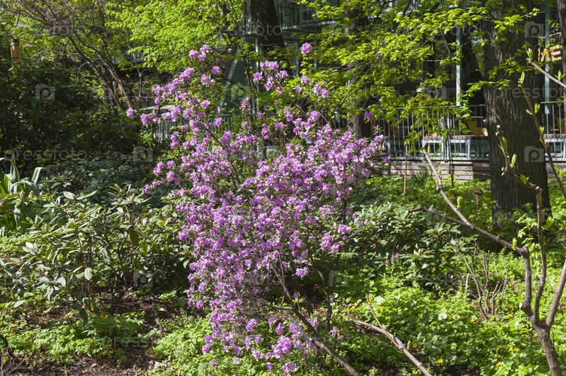 Цветение рододендрона даурского (лат. Rhododendron dauricum) в ботаническом саду Солнечный день в середине мая Аптекарский Огород (филиал ботанического сада МГУ), Москва