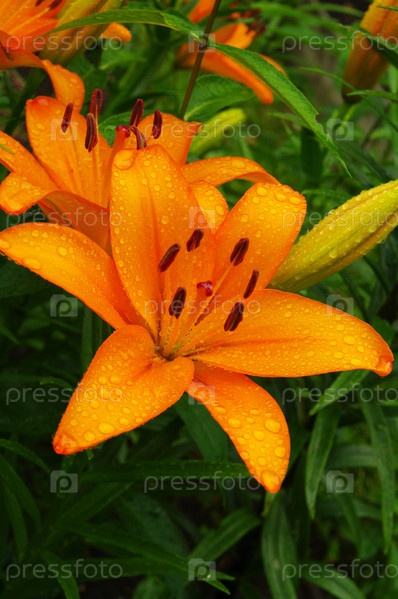 Красивые цветущие оранжевые лилии с каплями воды на лепестках после дождя под ярким летним солнцем