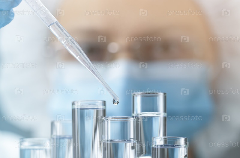 Ученый или ассистент в защитной маске добавляет жидкость из пипетки в одну из пробирок. Концепция развития науки, генетических исследований, фармацевтических технологий или биотехнологий