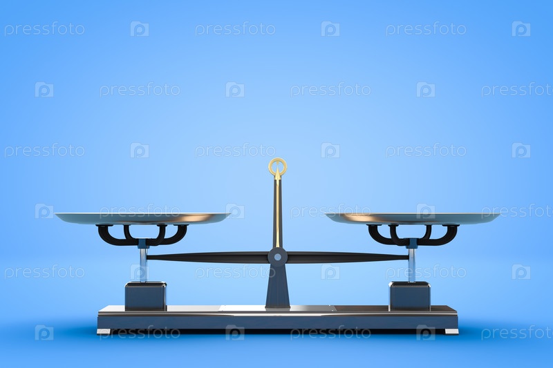 Сбалансированные весы весов на синем фоне. Вид со стороны. С копирайтом. 3d визуализация