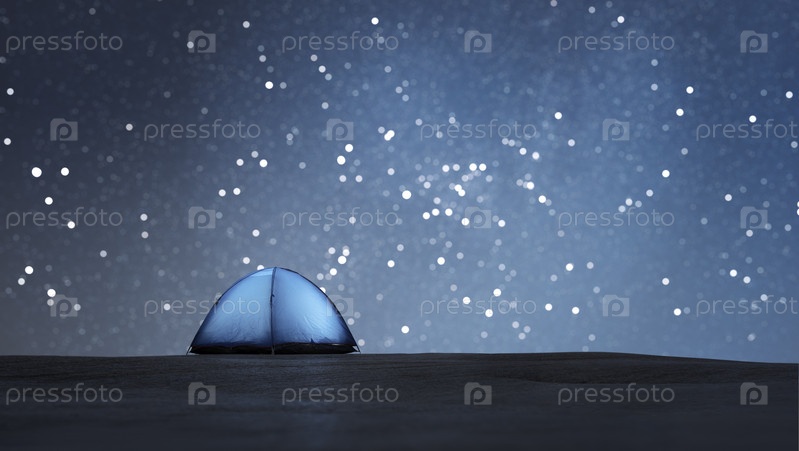 Светящаяся палатка. Звездное боке на заднем плане. С копирайтом
