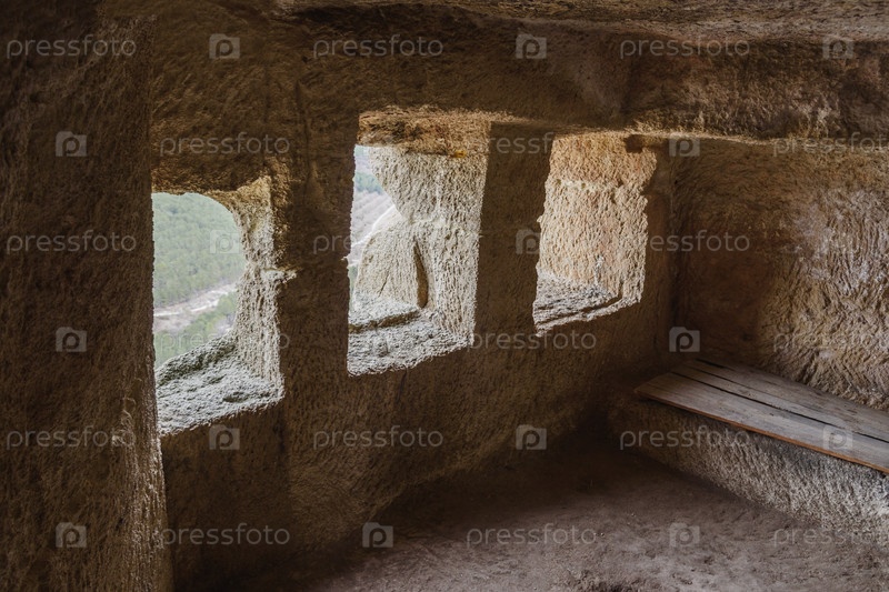 Внутри пещерной комнаты в пещерном городе Чуфут-Кале в Бахчисарае весной, Крым