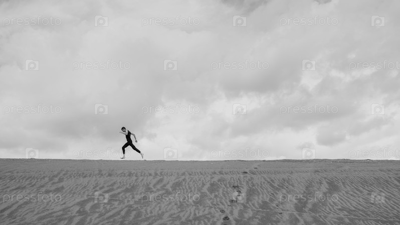 Одинокий человек бежит по песку через песчаную пустыню