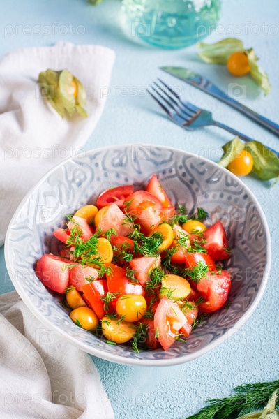 Аппетитный салат с физалисом, помидорами и укропом в миске. Вегетарианская диета. Вертикальный вид
