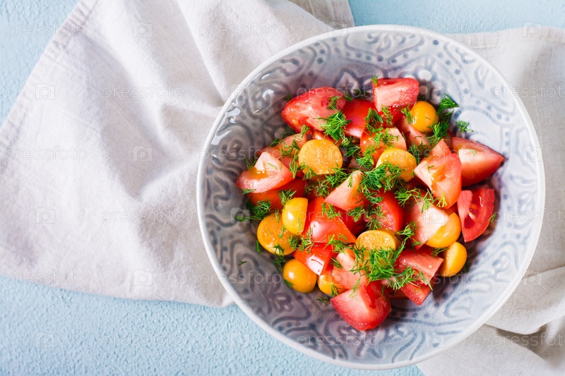 Вкусный салат из помидоров, физалиса и укропа в миске. Вегетарианская пища. Вид сверху. Крупный план