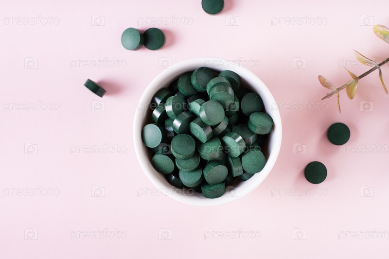 Детокс продукты. Водоросли спирулины в таблетках. Вид сверху. Крупный план