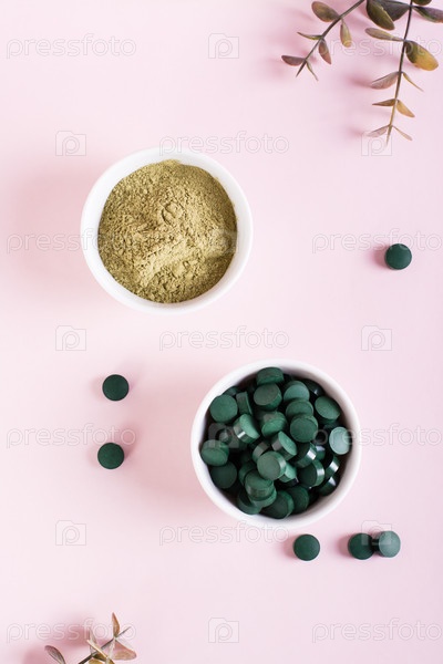 Детокс и антиоксидант. Порошок матча и таблетки спирулины в мисках на розовом. Верхний и вертикальный вид