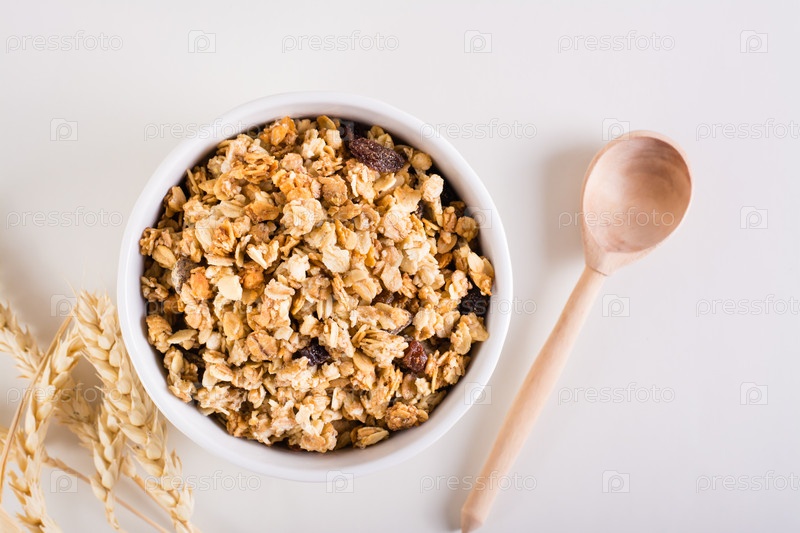 Запеченная мюсли в миске, деревянная ложка и уши на столе. Здоровый завтрак. Вид сверху