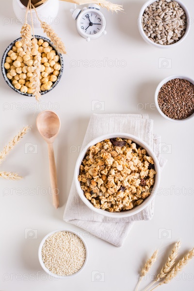 Сухие мюсли, семена кунжута, семена льна, семена подсолнечника, нут и лебеда. Верхний и вертикальный вид