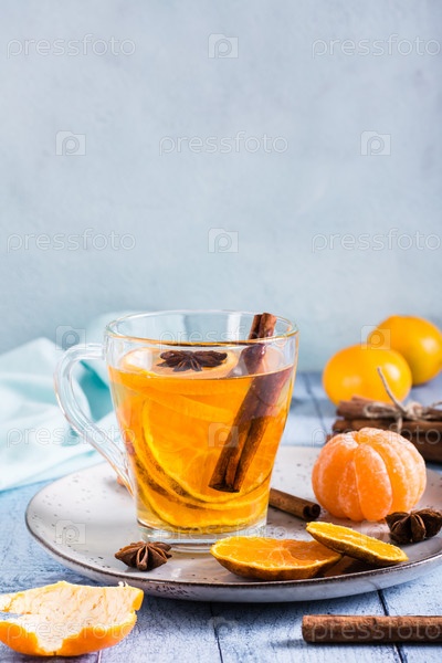 Мандариновый чай с корицей и анисом в чашке на столе. Антиоксидантная диета. Вертикальный вид