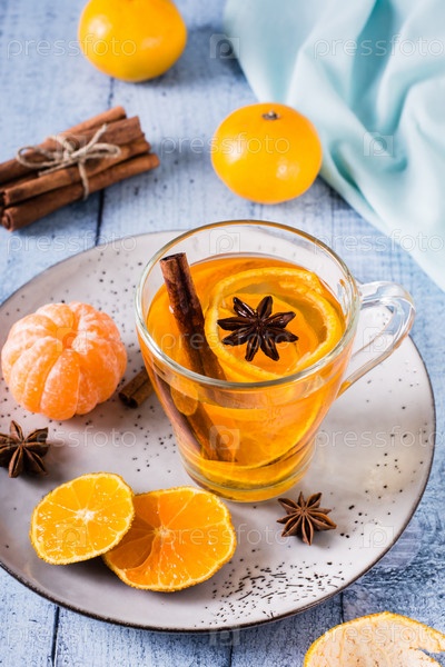 Свежий мандариновый чай с корицей в чашке на столе. Витаминный напиток. Вертикальный вид