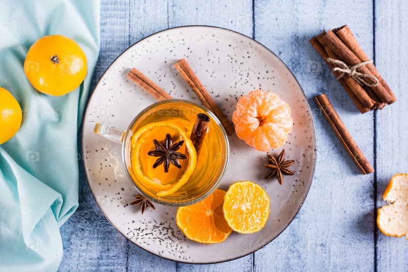 Мандариновый чай с корицей и анисом в чашке на столе. Антиоксидантная диета. Вид сверху