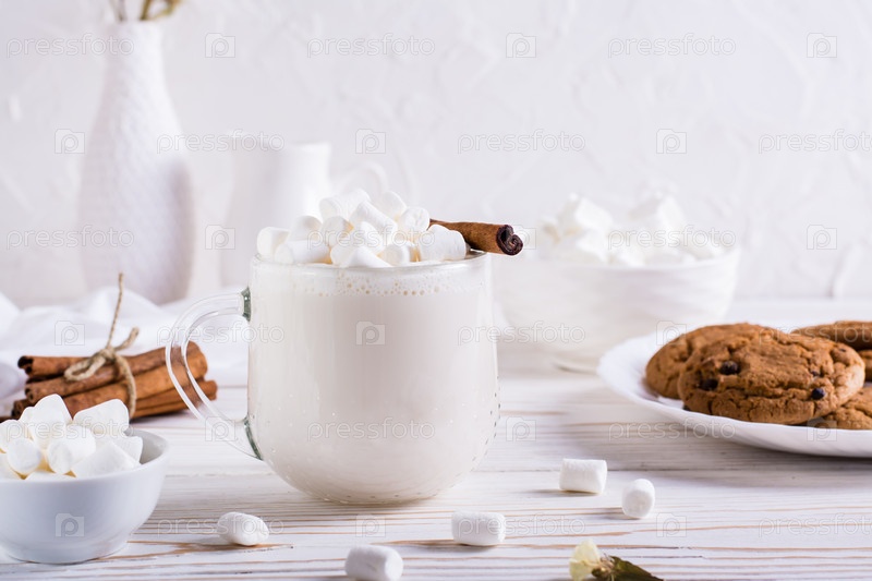 Теплое какао с зефиром и корицей в чашке и тарелка овсяного печенья на столе