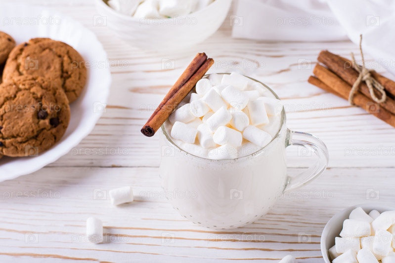 Молочный латте с зефиром в чашке и тарелка с домашним печеньем на столе. Привычная пища