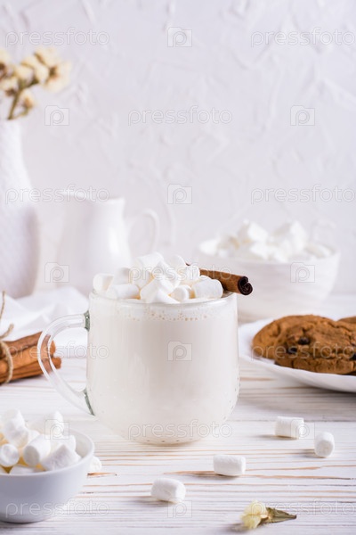 Теплое какао с зефиром и корицей в чашке и тарелке овсяного печенья. Вертикальный вид
