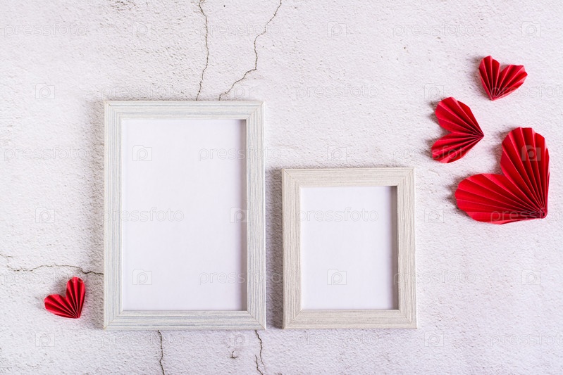 Бумажные красные сердечки своими руками вокруг пустых фоторамок на бетонном фоне. День Святого Валентина