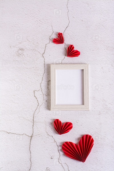 Красные бумажные сердца DIY вокруг пустой фоторамки на бетоне. День святого Валентина. Вертикальный вид