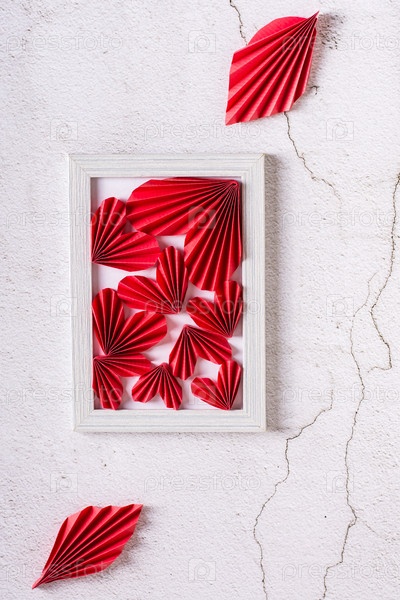 Красные бумажные сердечки в пустой фоторамке и листья на бетонном фоне. Вертикальный вид