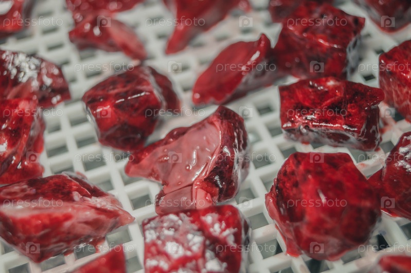 Кусочки свежего мяса в лотке электрической сушилки для обезвоживания пищи. Сушка пищи. Выборочный фокус