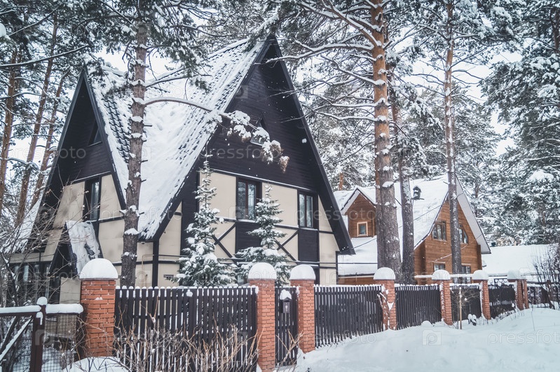 Загородный дом в деревне зимой. Сельская улица с частными домами и соснами. Выборочный фокус
