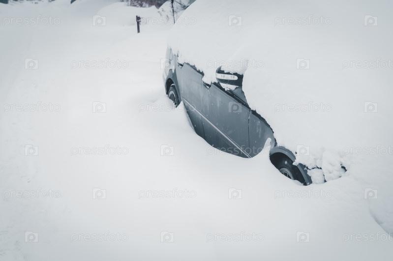 Брошенная на дороге машина засыпана снегом. Последствия прошедшей метели. Зимний катаклизм, аномальное количество снега. Выборочный фокус