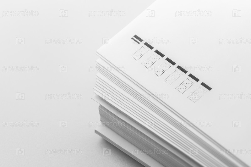 Стопка больших белых почтовых конвертов. Упаковка для писем и документов. Почтовые поставки. Индексный код. Выборочный фокус
