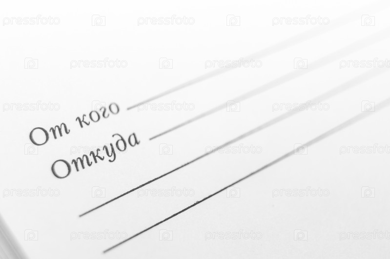 Адресная строка отправителя письма на белом почтовом конверте. Русский текст - От кого, Откуда. Выборочный фокус