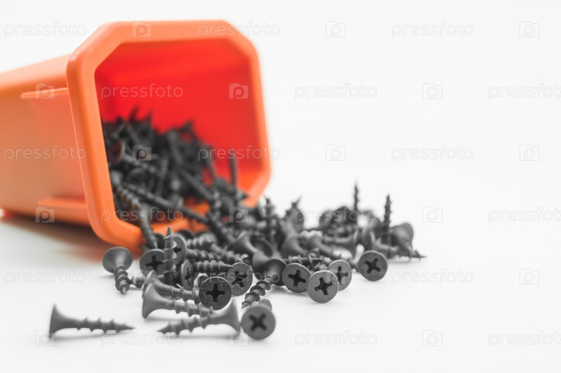 Черные винты в оранжевой коробке. Россыпь металлических креплений. Крупный план коротких винтов. Избирательный фокус, изолированный на белом