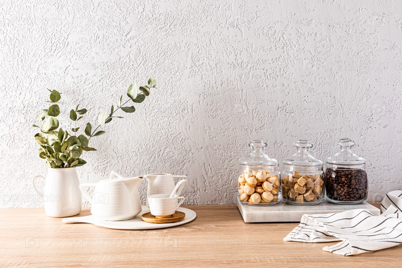 Красивый кухонный фон с предметами и продуктами для чайной церемонии. стеклянные банки с чаем, сахаром, печеньем, белым чайником и чашками