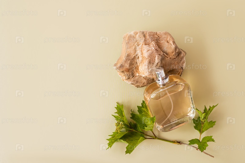 Стеклянная бутылка парфюмированной воды или косметического средства с натуральным ароматом, прислоненная к бежевому камню. копия пространства