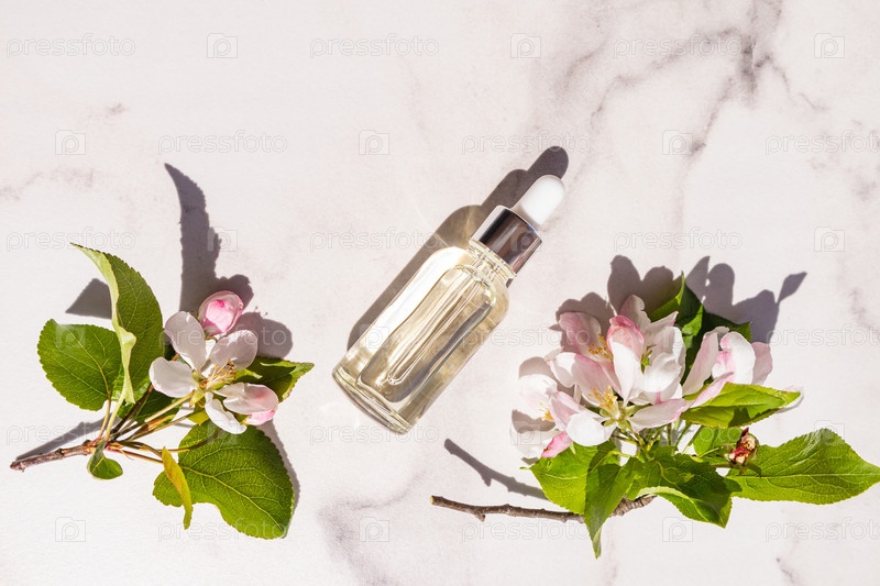 Прозрачный флакон с сывороткой для ухода за кожей лица и тела. омолаживающая натуральная косметика. вид сверху. мраморный фон. розовые цветы яблони