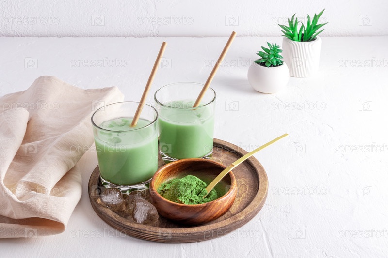 Свежеприготовленный чай матча латте с кубиками льда на деревянном подносе и миска зеленого порошка матча для приготовления пищи. белый фон. Детокс