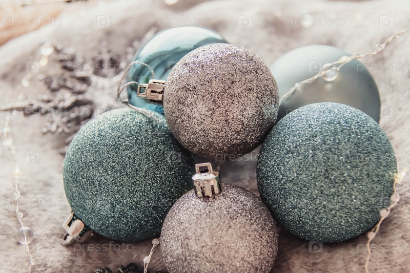 Множество синих и серебряных шариков расставлено на мягком уютном свитере