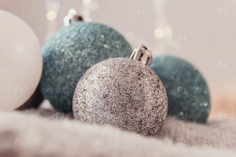 Новогодние шары синего и серебряного цвета на сером свитере