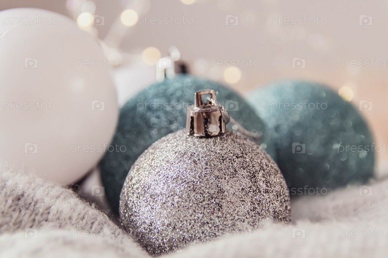 Серебряный шар в центре. Вокруг много синих елочных шаров