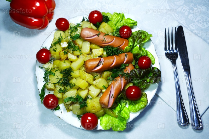 Картофель жареный, сосиски, помидор черри