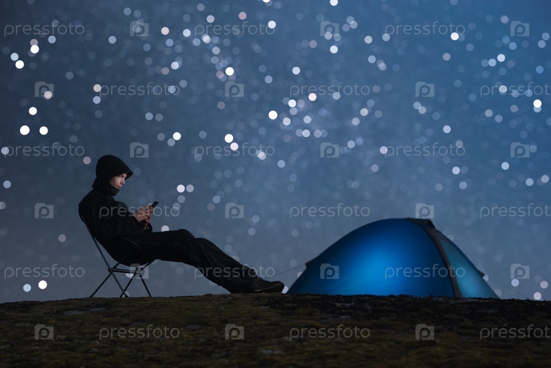Турист использует смартфон в удаленной локации. Палатка и звездное небо на заднем плане