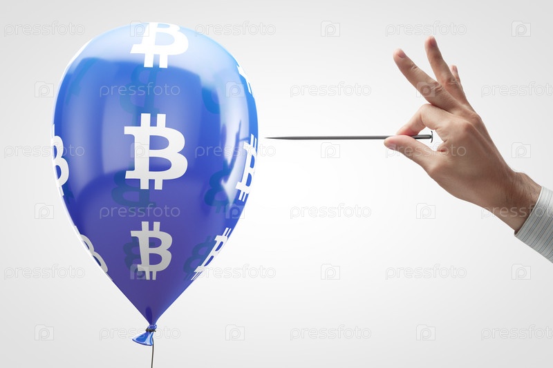 Концепция: Обесценивание криптовалюты. Символ криптовалюты на голубом воздушном шаре и игле в руке