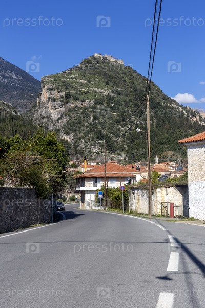 Улица с каменными домами в деревне и видом на крепость на горе