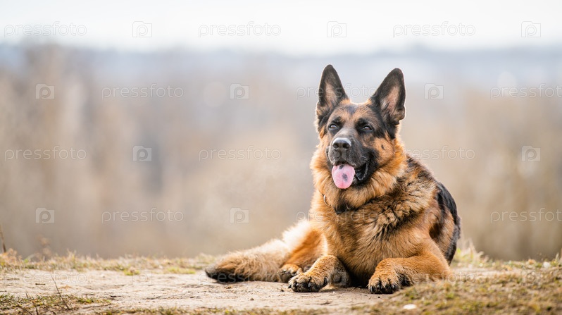 Портрет немецкой овчарки взрослой большой собаки, лежащей на сухой траве на природе весной или осенью